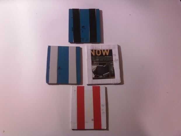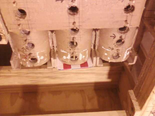 En la parte inferior de cada tubo eran cartón ranuras que piezas delgadas de cartón o de plástico (4 pulgadas de largo por 3 1/2 pulgadas de ancho) que seguro no pesos iría inesperadamente todo el camino a través de los tubos.