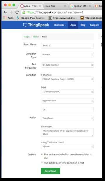 Otra solución simple como se explicó antes, es enviar un Twitter directamente desde la Web. En este caso puede utilizarse la característica de "Reaccionar" de ThingSpeak.com.