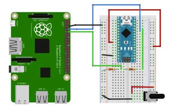 Para fines de pruebas, un potenciómetro se conectó al puerto analógico Arduino A0 y el valor que se transmite a través de serie para el IPC. En la prueba, RPi leerán un teclado (conectar a él o a través de VNC) y según el comando, el LED Arduino conmutar "ON/OFF".