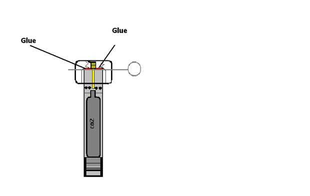 Ahora necesitas pegar el tubo a la tapa más pequeña. La parte superior del tubo del pegamento y pegarlo en la tapa más pequeña. Asegúrese de que cuando pones el tubo en la tapa el dosent de pin de inflador en contacto con el co2. También asegúrese de que los orificios que ha perforado no pegados a la tapa, asegúrese de que está pegando hacia fuera.