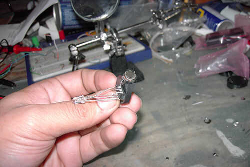 para reunir todo lo acabo de poner la foto boca abajo encima de la batería de la carcasa, con un pequeño punto de pegamento caliente, doblar las patillas de alimentación y grond alcanzar a la batería conduce y une el LED y el pegamento caliente un imán y yo estaba listo para ir, el tiempo de construcción total fue aproximadamente 1.5 minutos.