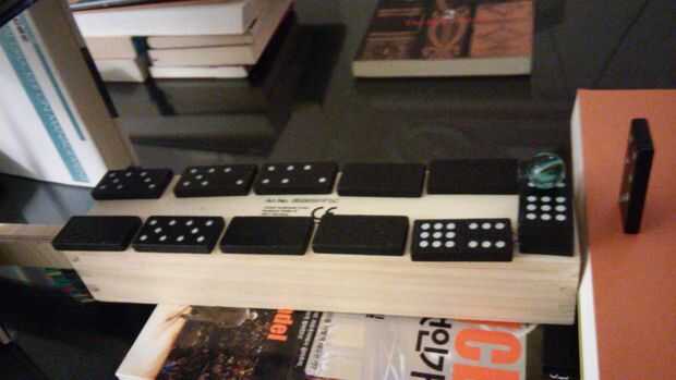 Justo debajo de la bola de tenis de mesa, un sostenedor del teléfono debe estar ubicado, y la cubierta de aluminio se debe poner sobre el titular del teléfono, creando un ángulo. Luego, a partir de la cubierta de aluminio, una línea de dominó debe configurarse. Las fichas de dominó deben girar a la izquierda y abordar una pila de escalera-como de books(15cm). Después de pasar por la pila de libros, los dominós gire a la derecha. Al final de la ruta del domino, hay una pequeña pila de dominos(4 cm) y una canica en la parte superior. Frente a la pila, poner el caso de domino, la apertura hacia abajo, y un tren de la línea recta de 3 carriles en la parte superior. Colocar un libro o algunos dominós debajo de la caja para llegar a la altura del mármol que se encuentra en el paso antes de éste. Al final del carril de tren, poner una rampa.