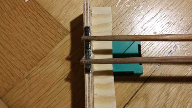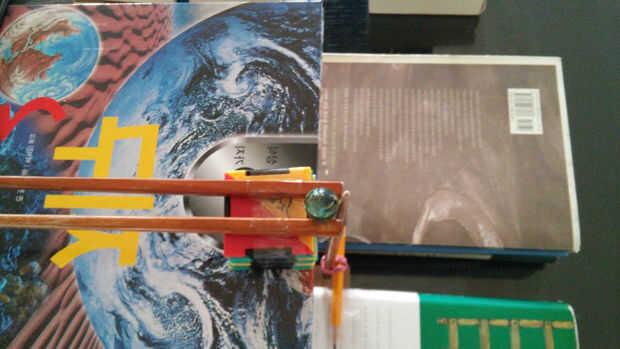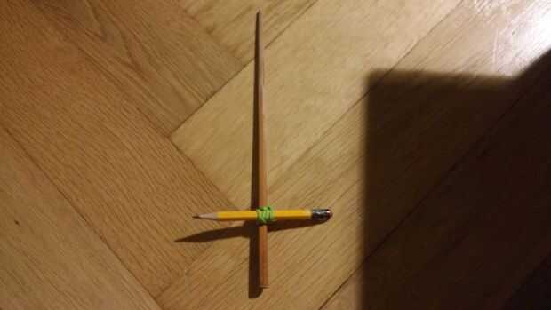 Después de eso, crear una cruz con un lápiz y un palo de palillos. El lápiz debe ser más corto que el palillo/palillos. Uso una goma a criss-cross atar el lápiz y el palillo/palillos. Coloque dos pilas de libros de izquierda y derecha del final de la rampa en la primera historia y asegúrese de que las pilas de libros son la misma altura. Luego, la cinta ambos extremos del lápiz a cada una de las pilas, para que la parte de palillo y pegar puede alcanzar el punto de partida para la segunda parte de la historia, entre los dos palillos/baquetas.