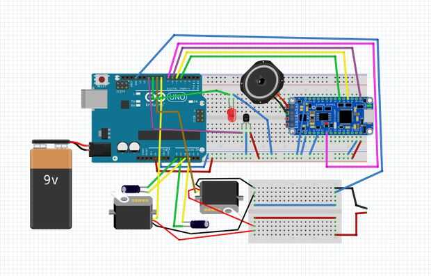 La primera imagen muestra cómo conectar su proyecto Whac-A-Mouse. Simplemente siga las conexiones de pin en el diagrama de Fritzing.