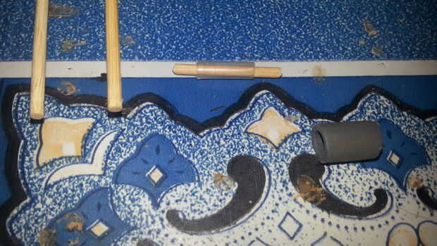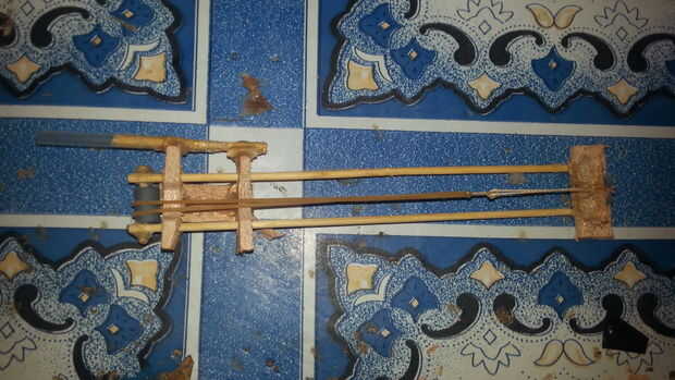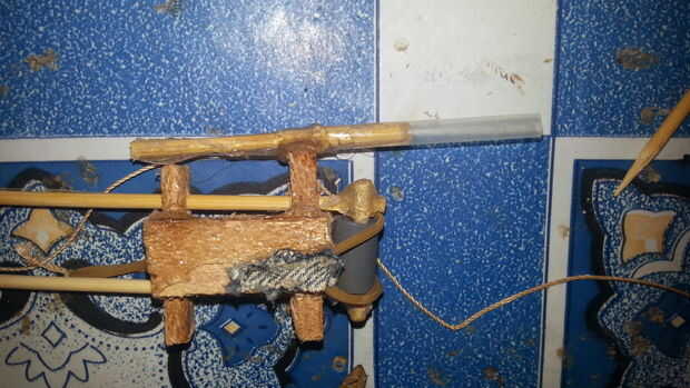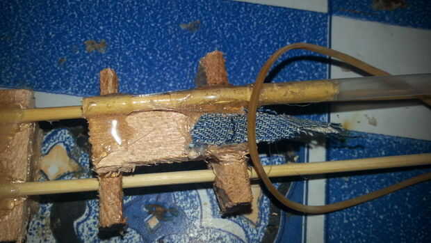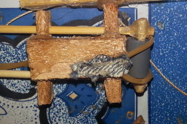Después de haber completado el paso uno, usted necesita cortar un pedazo de paja y su marcador de edad tubo pequeño, que cabe entre los dos pinchos. Luego cortar un trozo de brocheta que es suficiente para cubrir a través de dos pinchos. Primero poner la paja en el pequeño pedazo de pincho y el tubo. Después de eso, pegue el pincho corto al final de los dos pinchos largo como se muestra. La tubería debe poder girar libremente. Luego pegue un trozo de tela como se muestra y poner la goma en él. Luego pégalo sobre sí mismo, sosteniendo la banda elástica en ella como se muestra. Después de eso, cortar un pedazo de pincho de 2 1/2" de largo y un pice de paja de 1 1/2" de largo. Pegar la paja de 1/2" sobre la brocheta como se muestra. Luego pega la brocheta en el exterior de las dos piezas de madera que se deslizan. Luego Encole una pedazo de sting a la madera en la parte inferior y tire de la goma sobre el tubo (que se utiliza como una polea). El lazo de la goma de banda a la cadena para que siempre está un poco apretado, pero no demasiado apretado. Ahora usted debe poder bajar la parte deslizante, y cuando usted suelte debe resorte hacia arriba. Si no, intenta apretar la goma.