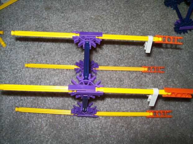 Ahora es la extensión del cañón, por lo que puede cruzar su hombro, usted se necesita 8 de esos conectores funly púrpuras y deslícelos a través de las ranuras, luego un amarillo barra a los extremos de la them.two de las varillas se necesitan gris doble conectores a través de ellos, y cuatro habrá conectores naranja en los extremos.