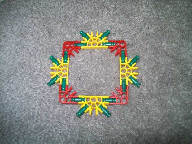 usted necesita 4 conector rojo, 4 conectores amarillos y 8 rods.make verde poco un cuadrado utilizando los conectores, los amarillo hacia fuera del círculo y poner dos barras verdes en cada amarillo como se muestra.