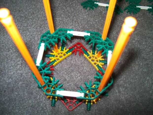 necesita 4 roods largo naranjas. Coloque una barra naranja en el centro de cada amarillo connector.then adjuntar los verdes como muestra, uno encima de otro.