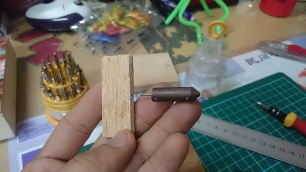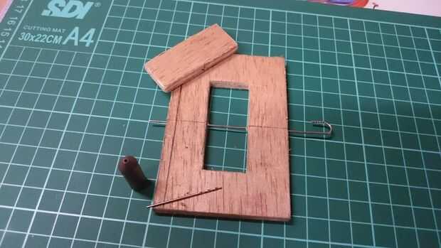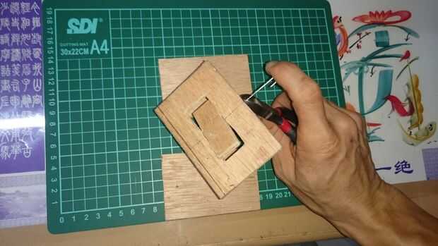 Estamos haciendo un eje. Utilice una broca de 1 mm (en este caso de prototipo) y perfore a través de la línea de Junta exterior e interior como se puede ver en las fotos anteriores. Enderece un clip y usarlo como la barra del centro. Este paso de perforación debe hacerse lenta y cuidadosamente bien, porque si los orificios no están en línea perfectamente, entonces la Junta no se tapa perfectamente y también es difícil conseguir el pin del clip a través de los agujeros. Que perforado a mano porque la madera es fina y no quiero a jodidos y empecé todo [el tiempo apremia...]. Por último cortar el clip excesivo en el borde del tablero externo.