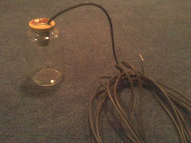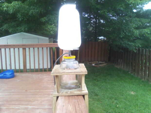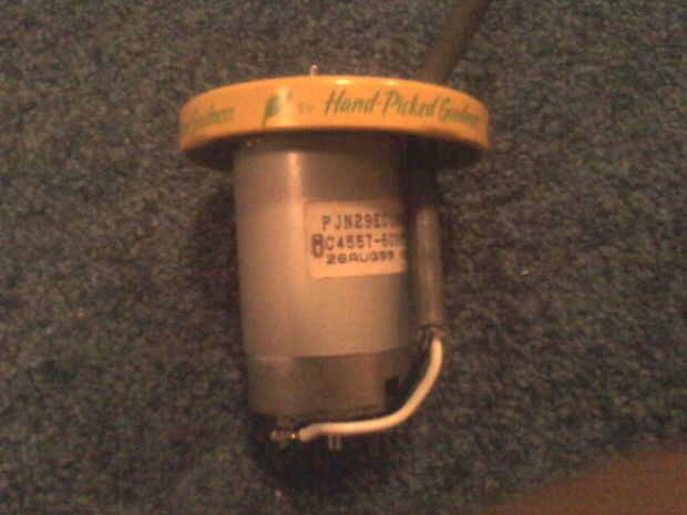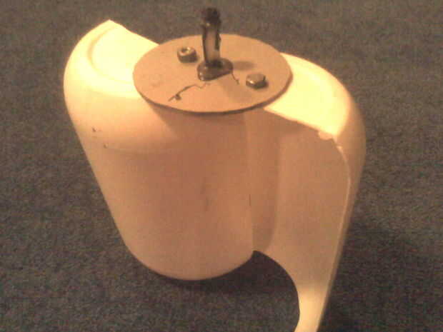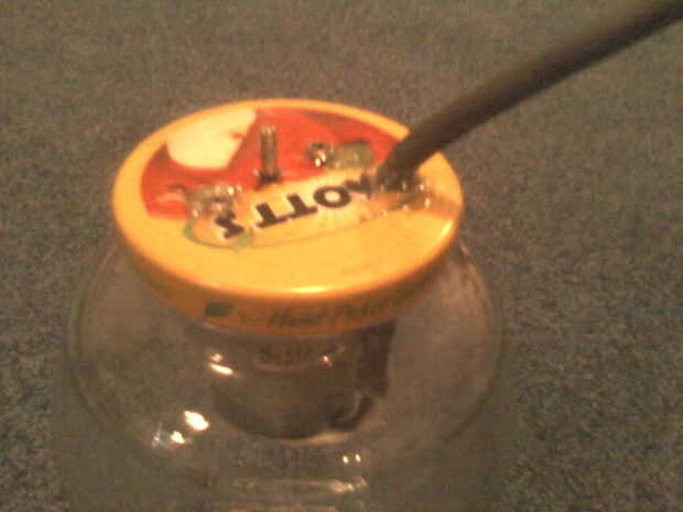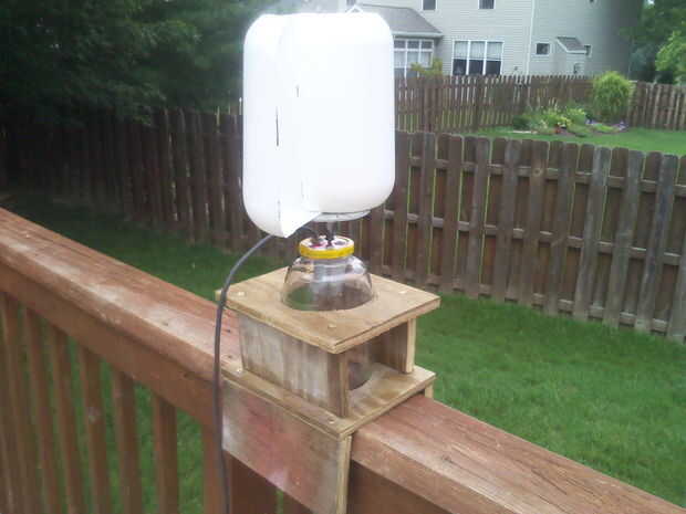 Para hacer la turbina, corté un gran frasco de plástico por la mitad con una cuchilla de afeitar y mi herramienta rotativa Dremel. Las dos mitades fueron offset para crear a una especie de forma de "S" para atrapar el viento desde todas las direcciones y atornilladas a una pieza de corte plástico de la carcasa de un escáner de ordenador no trabajo rescatado. Un pequeño trozo de tubo de polipropileno fue utilizado para conectar la pieza de plástico en la parte inferior de la turbina a un engranaje pequeño usinjg JB Weld. El pequeño engranaje deslizarse perfectamente en un pequeño motor DC del mismo escáner de ordenador como la pieza de plástico. El motor de la C.C. fue atornillado a la tapa de un frasco de compota de manzana con pegamento caliente, colocada sobre tornillos para ayudar a evitar que la humedad penetre dentro del frasco. Un alambre largo de una aspiradora rota fue conectado a los cables del motor DC y conectado al aparato de electrólisis.