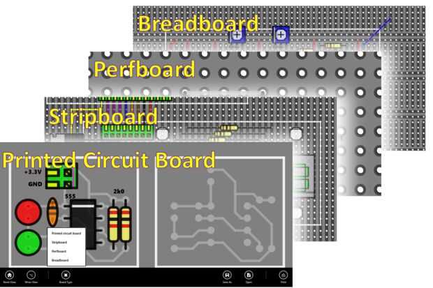 A Seleccione la placa de prototipos para construir su circuito, click derecho/golpe de la parte inferior para abrir la barra de la aplicación y elegir el Consejo correcto en el menú "Tipo de tarjeta".