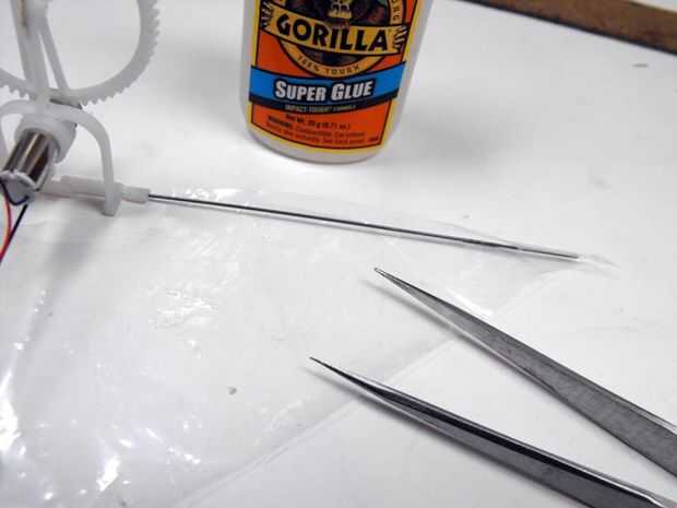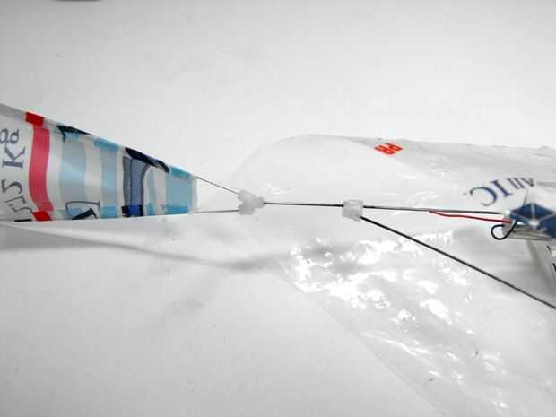 Había comprado una bolsa de hielo y decidió que el plástico de de que la bolsa fue hecha funcionaría bien para las alas. Estoy muy, muy, cuidadosamente aplicado pegamento a las costillas de alambre, había doblado los bordes de la hoja de plástico encima y aplica abundante presión para exprimir el pegamento por toda la longitud de la costura.