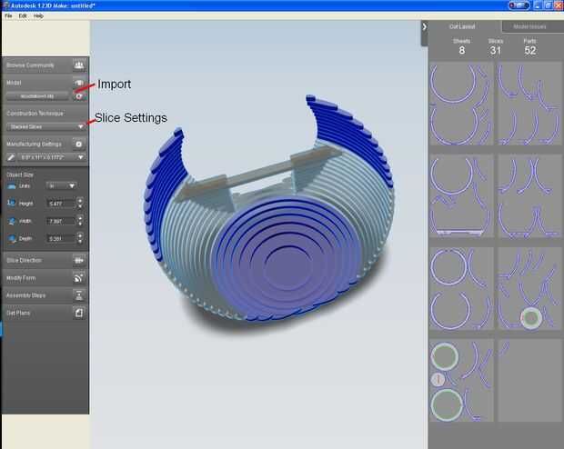 Para que tengas tu archivo. ¿Es un OBJ? Bien tiene que ser para hacer 123D. Si no es así, no debería ser difícil llegar allí. Como es un tipo de archivo abierto podrá importar a Blender, Netfabb o Meshlab (todos los programas gratis) y poder exportar al objeto Ahora que tienes tu OBJ abrir Make 123D e importarlo. Hay un botón de la izquierda que dice importar..., haga clic en y seleccione el archivo. Una vez que se haya cargado, usted podrá seleccionar su técnica de construcción. Jugar con ellos, ver lo que se ve mejor y funciona para ti. Para mi ejemplo, usé rebanadas apiladas como el tema era sonido proyecto y quería que sea cerrada como sea posible. Ahora usted puede configurar su material.