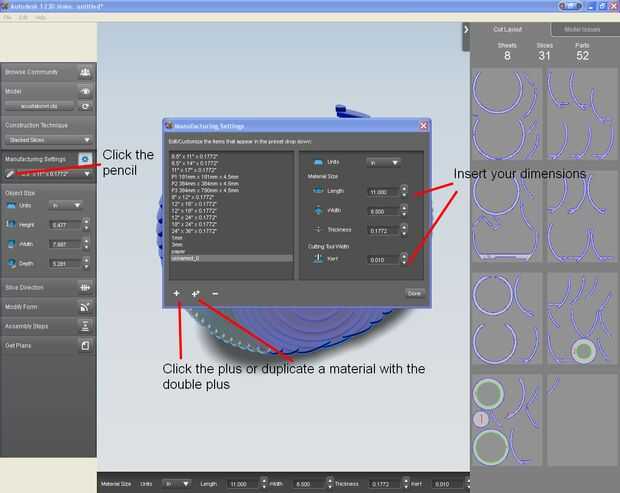Ahora tu en rodajas y listo para ir a la derecha? Todavía no. Ahora tienes que configurar el material. Haga clic en el lápiz en la configuración de fabricación. Aparecerá un menú con diferentes materiales predefinidos. Que puede seleccionar un material existente haciendo clic derecho, luego crear un duplicado con el doble más o simplemente, haga clic en el más solitario para realizar un nuevo material. Defina las unidades y el tamaño de su material. Si la impresión en papel normal establece el tamaño del material en el área imprimible de la impresora. Seguro tomar media pulgada el papel tamaño, así que voy a poner en 10.5 para la longitud y 8 de la altura. Para el espesor, medir el espesor de la cartulina acanalada. El corte no es tan importante para nosotros, como cuando su corte sólo puede aspirar para el interior de la línea. no duele para que sea grueso para que sea fácil de ver. Ahora que ya tiene su hit conjunto, material hecho. Ahora seleccione su nuevo material en la lista desplegable, al lado del lápiz en la configuración de fabricación.