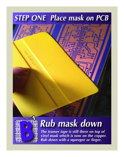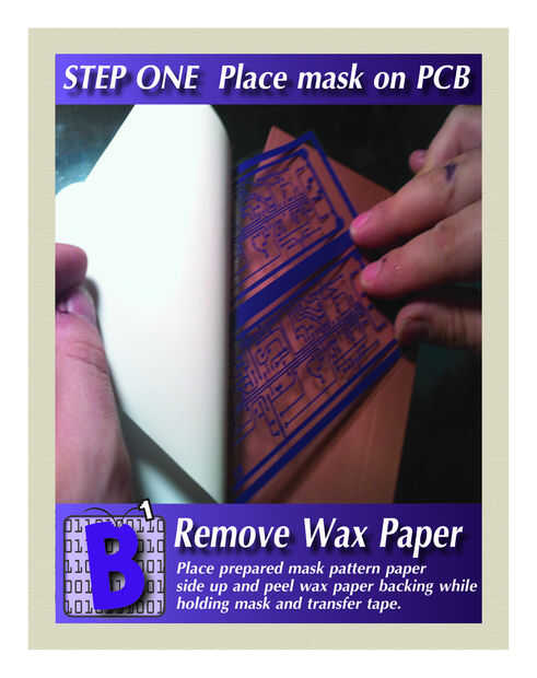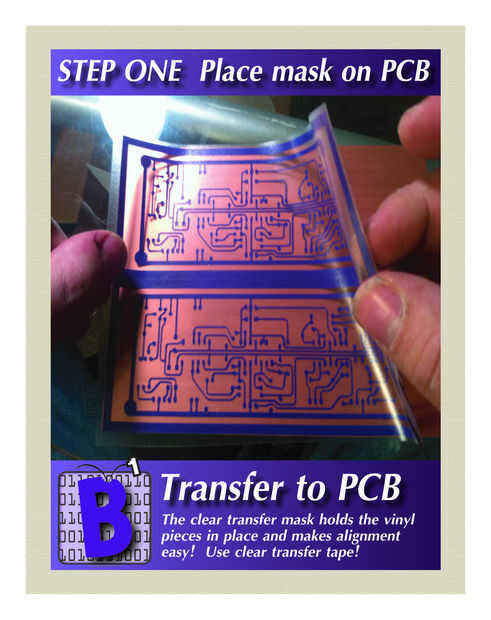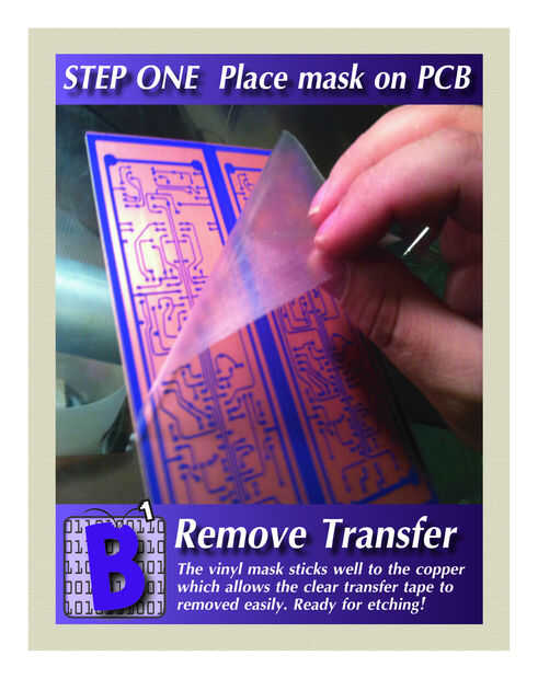 A partir de una esquina - cáscara de la cinta de la transferencia de y la máscara de vinilo se quedará en el copperclad PCB.