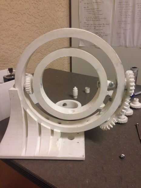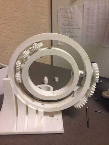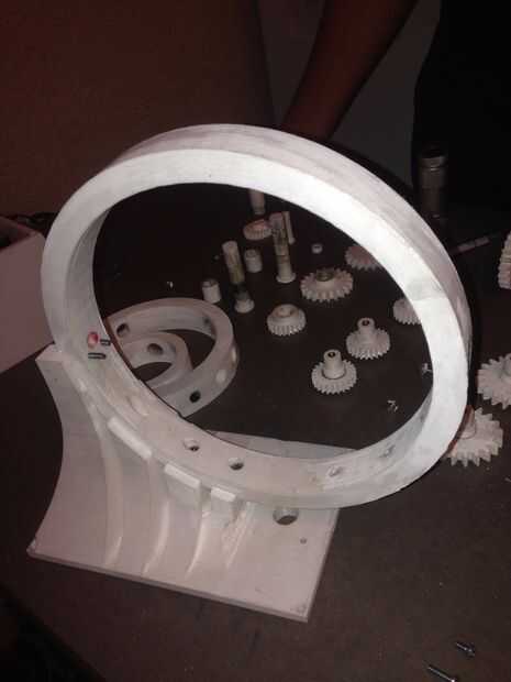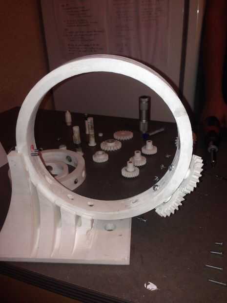 Comenzando con el anillo exterior fijo, dos conjuntos de perno-engranaje pueden ser instalados como se muestra en el cuadro segundo. Esto se hace simplemente colocando el pin en las tomas del anillo exterior y corriendo luego 0,375" o 0.5" #6-32 Tornillo de máquina a través del agujero y la rosca del grifo de latón. Asegúrese de ajustar la retención, si atornillar demasiado apretado, limitará cómo libremente el engranaje puede girar sobre el perno de. Dejar la instalación de la tercera Asamblea de perno-engranaje que es la más cercana a la base para el último. Simplificará el proceso más tarde.