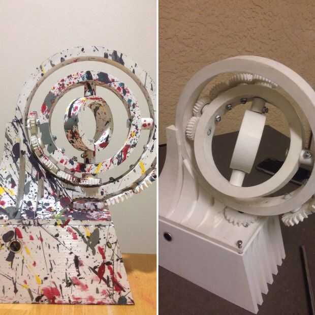 Si ha seguido con éxito este instructable hasta aquí, su sistema de control debe ser funcional y todas las piezas debe ensamblarse con espacios adecuados. Todo lo que me queda para presentar es lo que decidí hacer con mi modelo original. El concepto detrás de esta escultura que realmente me llamó la atención fue la de la dualidad (piensa en Ying y Yang). Como se mencionó anteriormente, se trata de un 1 grado del mecanismo de la libertad. Esto significa que hay una fuerza de entrada y una salida de movimiento. Una gran cantidad de tiempo y consideración fue asignada a diseñar geometrías que permitan la transmisión de torsión a través de la escultura, espacios libres para facilitar el movimiento cuando es necesario y la colocación de las uniones mecánicas para mantener la estabilidad a pesar de la rotación de los anillos internos. Donde la dualidad se hace es con el uso de la "pintura de acción", una técnica que se hizo popular por Jackson Pollock en la década de 1930. Esta técnica destaca es el uso de un lienzo, o un objeto como un medio de incitar a la imaginación del espectador. Lo que quiero decir con esto es que aunque puede no ser capaz de mirar una pintura de acción y derivar cualquier estructura o figuras de él, se puede imaginar el movimiento que se requiere para hacer cada una de las líneas, curvas y manchas. Eso es lo que el arte, el movimiento. La pintura sí mismo sirve como un fósil o un trozo de billete que impiden al ir a ver uno de tus músicos favoritos o películas.