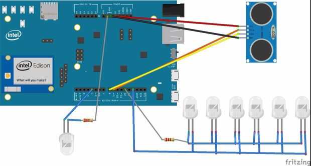 Utilice el cuadro para guiarte en la conexión a la Edison Intel, asegúrate de que tienes cables para conectar el sensor y la luz trasera en la parte trasera de su bicicleta y el LED en el frente.