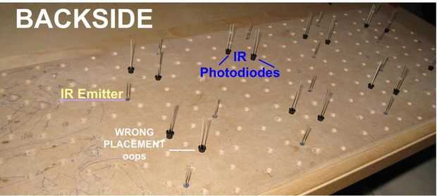 IR el sensor es un simple divisor de tensión anterior por dos fotodiodos IR paralelo que se conectan invertido parcial. Cuando un fotodiodo se revierte parcial (como un LED conectado al revés) actúa como una resistencia variable que cambia de resistencia con respecto a la cantidad de luz (luz infrarroja principalmente) caer en él. La alta resistencia del segundo valor estático 1 Megohm (R2) proporciona un divisor del voltaje con el levantamiento de nodo divisor en tensión con un aumento en la luz de IR cayendo en la photodiodes(R1).