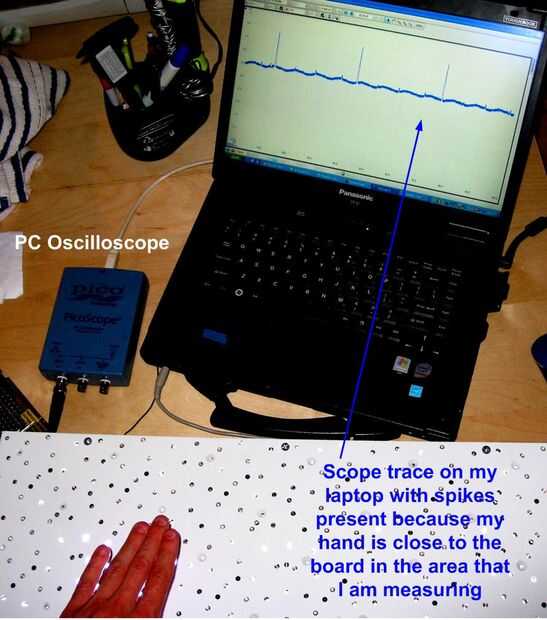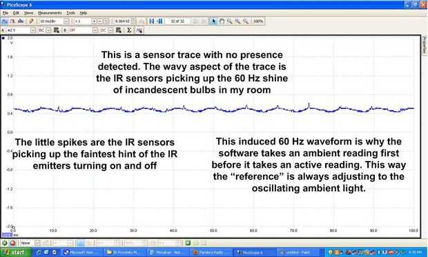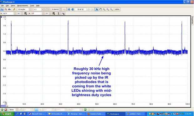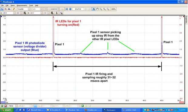 Dos emisores de infrarrojos están conectados en serie por píxel. La tensión de alimentación es de 5 volts. El resto de la tensión se cae por un resistor de 10 ohmios pequeño para regular el flujo de corriente alta. Los emisores de IR y los fotodiodos IR están conectados a la fuente de 5V. Cuando se encienden los emisores de IR, una pequeña cantidad de corriente es realmente tiró lejos el arreglo de divisor de tensión fotodiodo IR. Los fotodiodos está revirtiendo parcial permite que esto suceda. Este flujo inverso crea una caída en el nivel de voltaje en el nodo donde se toma la lectura de ADC. Me deshice de este poniendo un capacitor de pequeño valor (47pF-100 pF) en la resistencia de 1Mohm del divisor de voltaje. Esto reduce el nivel de inmersión, pero también cuesta tiempo para cargar el condensador cuando el nivel de voltaje se eleva rápidamente. Todo esto se ve fácilmente con un osciloscopio. He adjuntado fotos snap de mi osciloscopio pantalla de lectura. Esta es la fuente de requerir software dejar un tiempo, a tiempo para el nivel de voltaje llegar a su pico en el nodo muestreado del divisor de voltaje.