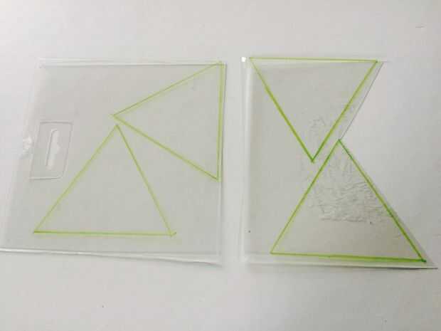Obtener su marcador permanente y traza cuatro triángulos equiláteros en su plástico fino usando una regla.