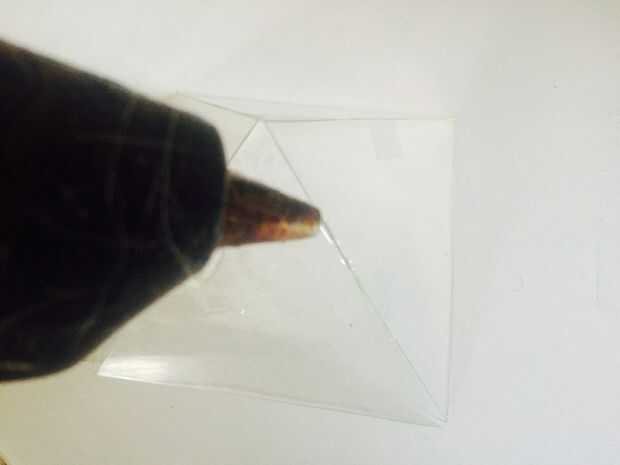 Esto es donde la cinta y el pegamento caliente para jugar, cinta de los bordes de un lado de cada uno de sus triángulos. Una vez que hayas pegado todas las diapositivas juntos las formas plásticas son pirámide. La cinta es una retención temporal hasta que se caliente unir los lados permanentemente. Uno que caliente pegue los lados usted puede elegir si o no quitar la cinta.