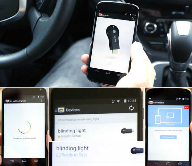 Abra la aplicación de Chromecast y comenzar la sincronización con el dongle Chromecast. El proceso es automatizado, así como se alimenta la mochila y en el proyector la aplicación sincroniza con el proyector. Cambia la pantalla del proyector para mostrar el progreso, y después de unos momentos el proyector será emparejado con el smartphone. Ahora puede convertir su pantalla.