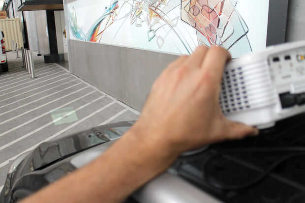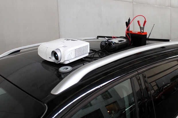 El proyector se enchufó en el inversor de corriente y la batería fue conectada con el inversor de energía, entonces todo fue colocado en la parte superior del coche. El proyector se enciende e inclinado hacia el suelo para aproximar la ubicación y el ángulo necesario para ver correctamente las imágenes desde el asiento del conductor.