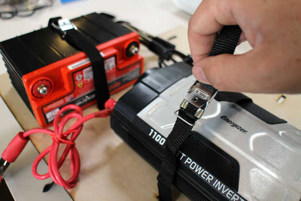 Para asegurar que los componentes no moverse mientras el coche está en movimiento fueron cada uno asegurados a la plataforma con correas. La zona wi-Fi móvil fue asegurada con una pequeña almohadilla de velcro.