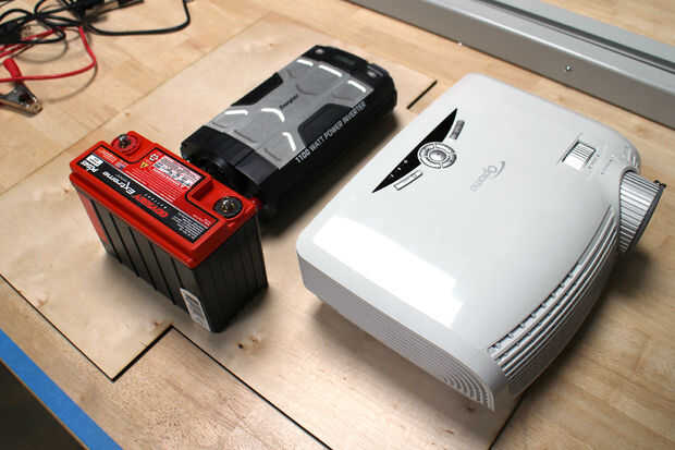 Arreglé el proyector hacia adelante, y el inversor y la batería fueron colocados detrás el proyector para reducir al mínimo la distancia de cable.