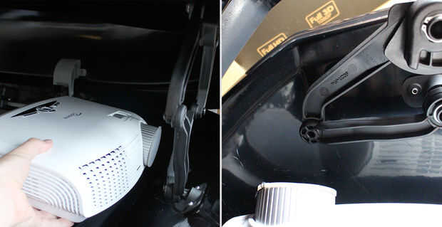 Con los componentes garantizados y en la colocación adecuada podemos marcar donde el lente del proyector se une con la caja de carga. El conjunto de componente se colocó dentro de la caja de carga, con la lente del proyector casi tocando la parte delantera de la caja. Un marcador fue utilizado para rastrear la ubicación de la viga del proyector estimado.