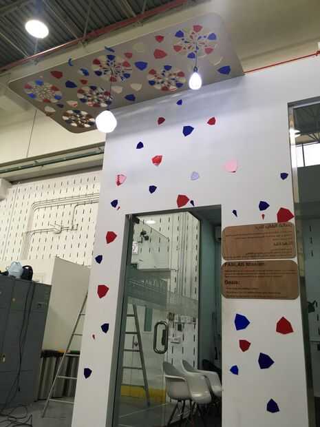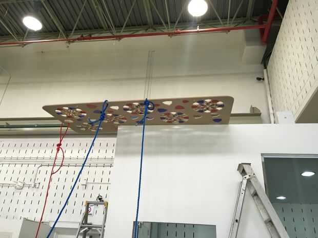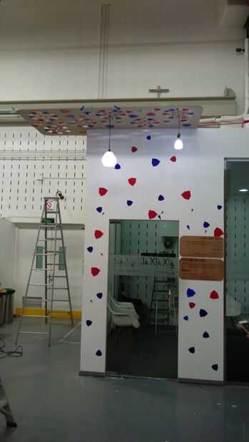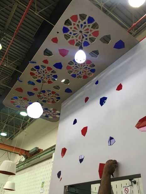 Aquí es nuestro producto final. Utilizamos la cinta de doble cara para pegar los cortes de acrílico extra en la pared. También utilizamos la cuerda para colgar la proyección de la puerta firmemente.