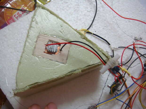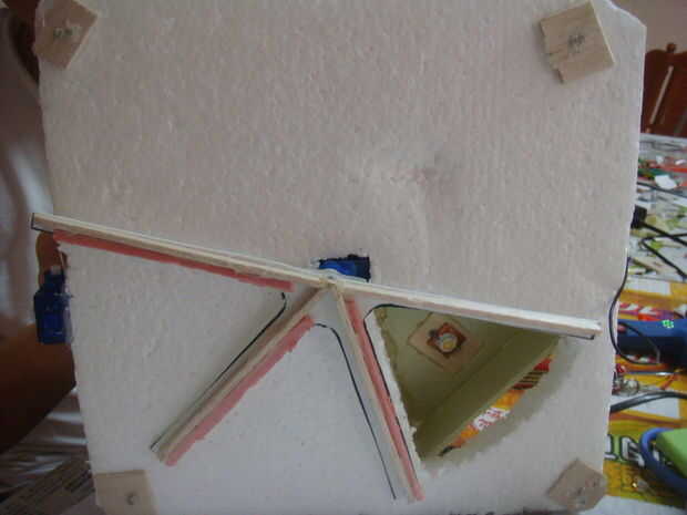 El giradiscos y el servo sirven para cambiar la proyección por giro del cortador de papel silueta o papel transparente. También puede utilizar un motor paso a paso para hacer girar la placa giratoria. Sin embargo, paso a paso es muy pesado de un servo. Recuerde que todos los componentes deben ser tan ligero como sea posible debido a la limitación de la elevación de la fuerza proporcionada por el helio.