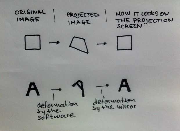 Proyectar una imagen a través del espejo en los pedazos de papel dará lugar a la deformación. Esto es causado por el espejo de sí mismo, por el hecho de que los pedazos de papel no están en perfecta alineación y por el hecho de que algunas de las piezas de papel rizo un poco. Por lo tanto, la imagen proyectada debe ser deformado de tal manera que la proyección resultante es igual a la imagen original.