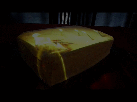 Tras filmarlo, basta con proyectar sobre tu pastel. Puede tener un pequeño margen de maniobra girando un poco su torta, elevándolo o cambiar la posición del proyector. Al final del día, los espectadores están buscando sobre todo en las partes iluminadas de la torta y no notarán los bordes que no que se proyectan en.