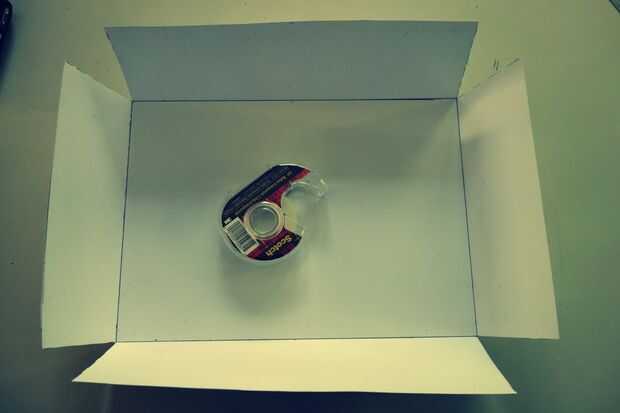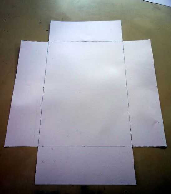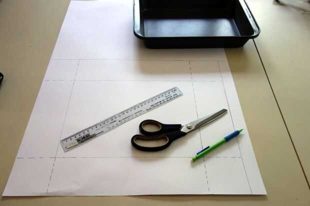 Utilizando alguna tarjeta de papel, mide las dimensiones de pastel con los moldes (1,5 vez la profundidad para tener en cuenta el espesor de dos capas, la pérdida y la formación de hielo). Anotó los pliegues con un bolígrafo (parte inferior) y había pegado a las esquinas.