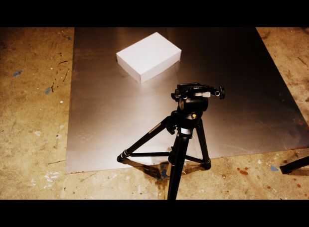 Configurar en el garaje en un metal de hoja en el piso. La chapa dio un agradable efecto reflexivo que fue bastante convincente sobre la mesa. El trípode fue instalado tan cerca como sea posible el ángulo que el proyector con respecto a la torta real. También asegúrese de que el ángulo de rotación de la torta es la misma: la torta es rotadas 40 grados del perpendicular por lo que tiene disponible para la proyección de 3 caras. No se olvide de acercar lo más cerca que puedas a los límites de proyección, y tienes la cámara establece en la misma relación de aspecto (16:9 o 4:3) como la salida del proyector. Cambiar el tamaño de la imagen es un verdadero dolor en el cuello, así que un poco de planificación antes de tiempo se sugiere fuertemente.