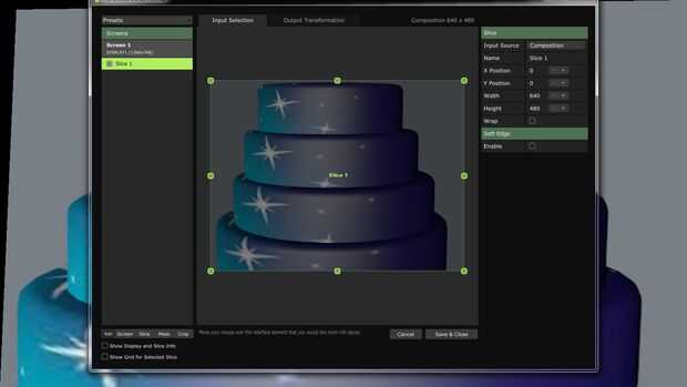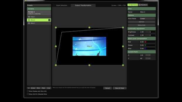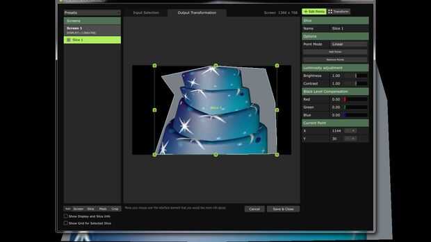 En la transformación de salida que puede aplicar deformaciones de la pantalla, permite ajustar la posición o la geometría en la salida final. Esto es útil para la proyección de asignación de la salida a una superficie de forma irregular, o cuando se alinean varios proyectores para una salida distribuido.
