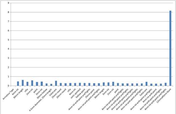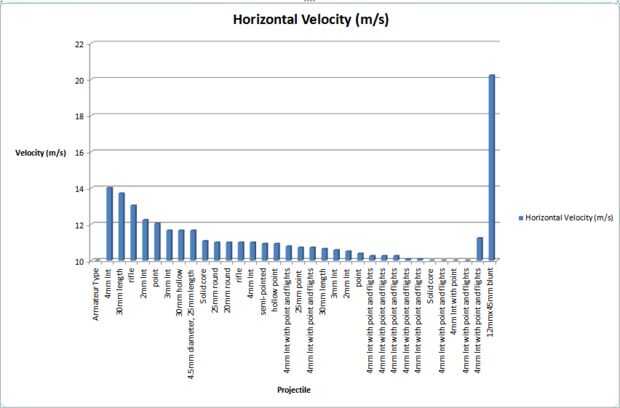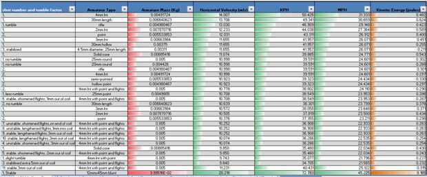 La hoja de excel extensión incluye los resultados para muchos diferentes proyectiles y las condiciones de inicio.