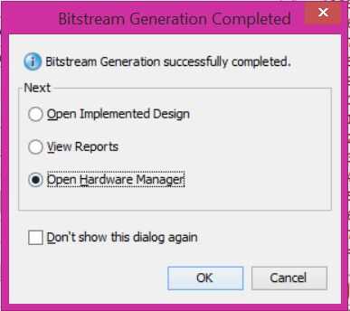 Después se genera el Bitfile, aparecerá esta ventana. Seleccione Administrador de hardware abierto y haga clic en Aceptar.