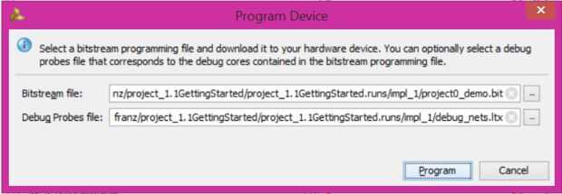 El bitfile correcta debe ser seleccionado, pero comprueba sólo para asegurarse. A continuación, haga clic en programa. Podrás ver el demo funcionando y mostrando los LED verdes excepto un LED que está apagado y moviéndose a través de los LEDs. Cambia el display de siete segmentos a través de los diferentes segmentos. Cuando esto termine termine este proyecto!