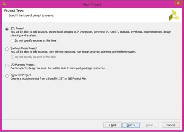 A continuación, eliges el tipo de proyecto apropiada. Vamos a elegir proyecto RTL . Vivado proporciona breves descripciones debajo de cada tipo de proyecto.