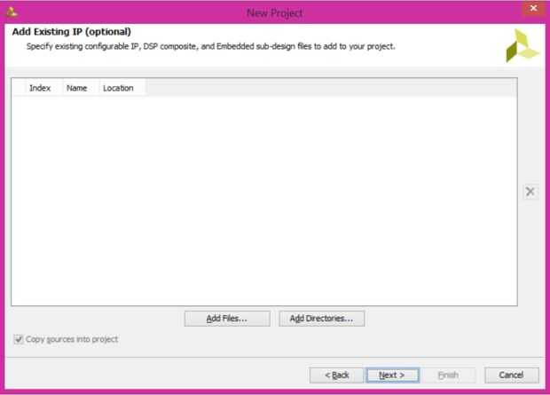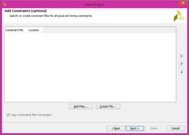 A continuación le pedirá para IPs o limitaciones. Otra vez, puede agregar estas aquí o más adelante, si lo prefiere. Las limitaciones es el archivo .xdc (.ucf en ISE).