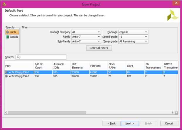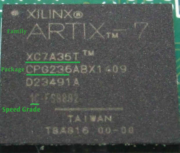 A continuación, Vivado le pedirá que seleccione la parte que usted se programación. Usted puede encontrar toda la información en el chip, o si es demasiado difícil de leer, en el manual de referencia. La imagen del chip es de los 3 Basys. He etiquetado la información necesaria para seleccionar la parte de él.