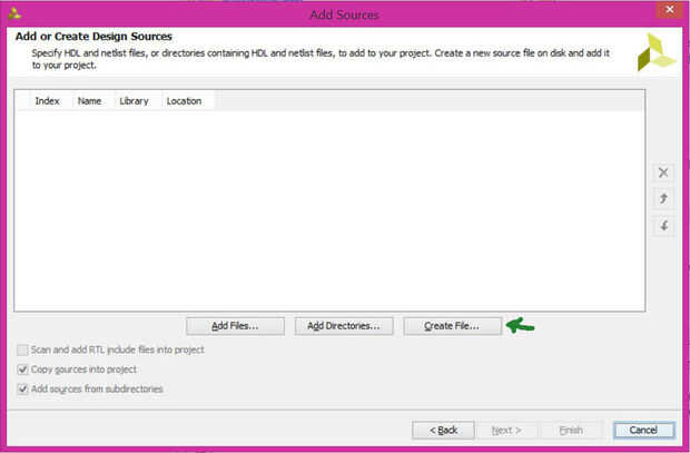 Crear un módulo de Verilog (.v) como se explicó en el anterior proyecto y asígnele el nombre "led_sw". Siga los mismos pasos como agregar el archivo existente .v, excepto que en lugar de presionar Agregar archivo Presione crear archivo. Añade fuentes de -> Agregar o crear el diseño de fuentes -> crear archivo. Luego del golpe final.
