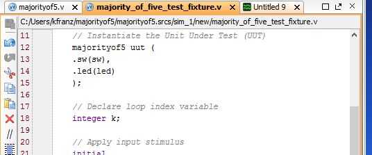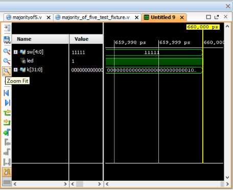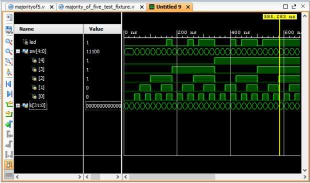 Aviso que es bien alta en cualquier momento tres interruptores o más son altos. Ahora ha ejecutado con éxito una simulación Verilog para la mayoría de los cinco!