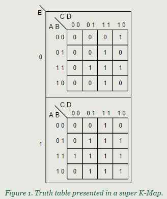 1. asumir que hay 5 personas (A, B, C, D y E). Si tres o más de ellos votan Sí, representado por un "1", el resultado es 1. Con esta información, llenar en un mapa K para representar la expresión lógica. Debe resultar en un super K-map como se muestra arriba.