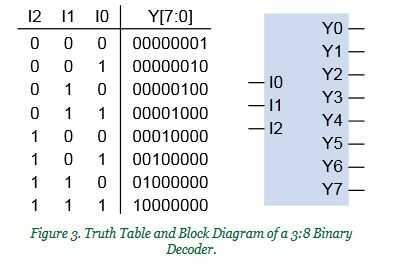 Circuitos del decodificador reciben insumos en forma de un número binario de N bits y generan una o más salidas según algún requisito. Un decodificador binario tiene N entradas y 2N salidas. Si las entradas de N se toman como un número binario de N bits, se afirma solamente la salida que corresponde al número binario de entrada. Por ejemplo, en el decodificador binario 3:8 se muestra en la figura 3 de arriba, si un binario 5 (o "101") se presenta en la entrada del decodificador, entonces sólo la 5ª salida del decodificador (Y5) a hacer valer y todas las otras salidas se afirmó.