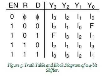 Una palanca de cambios es un circuito que produce una salida de N bits basada en unas entrada de N bits de datos y algunos bits de control, donde los bits de salida de N son copias cambió de lugar de los bits de entrada, y la manera que se desplazarán los bits es determinada por los bits de control. Por ejemplo, la tabla de verdad para un desplazador de 4 bits se muestra arriba en la figura 5. En el ejemplo hay tres bits de control (D, I, at). Permiten diferentes funciones: