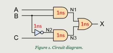 En este proyecto, vamos a implementar un circuito en Verilog y simular, habida cuenta de la demora. El circuito esquemático se muestra en la figura 1 anterior, y retardo de cada puerta está marcado en rojo.